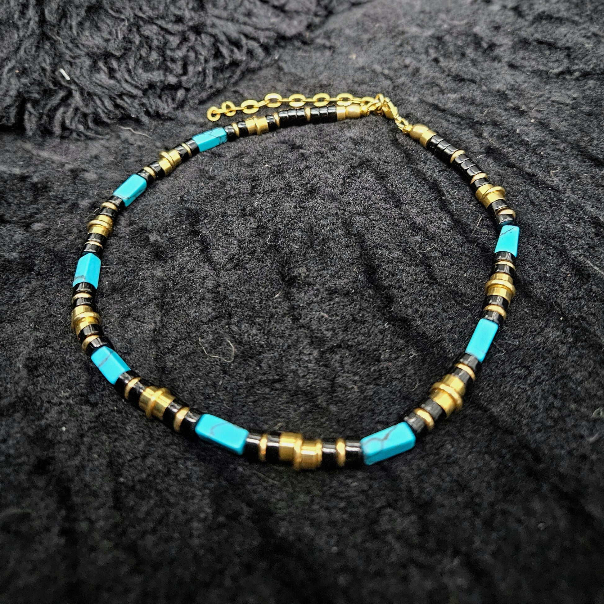 Beaded with real turquoise, black onyx, and solid brass breads this necklace channels the beauty and prestige of the ancient Egypt.