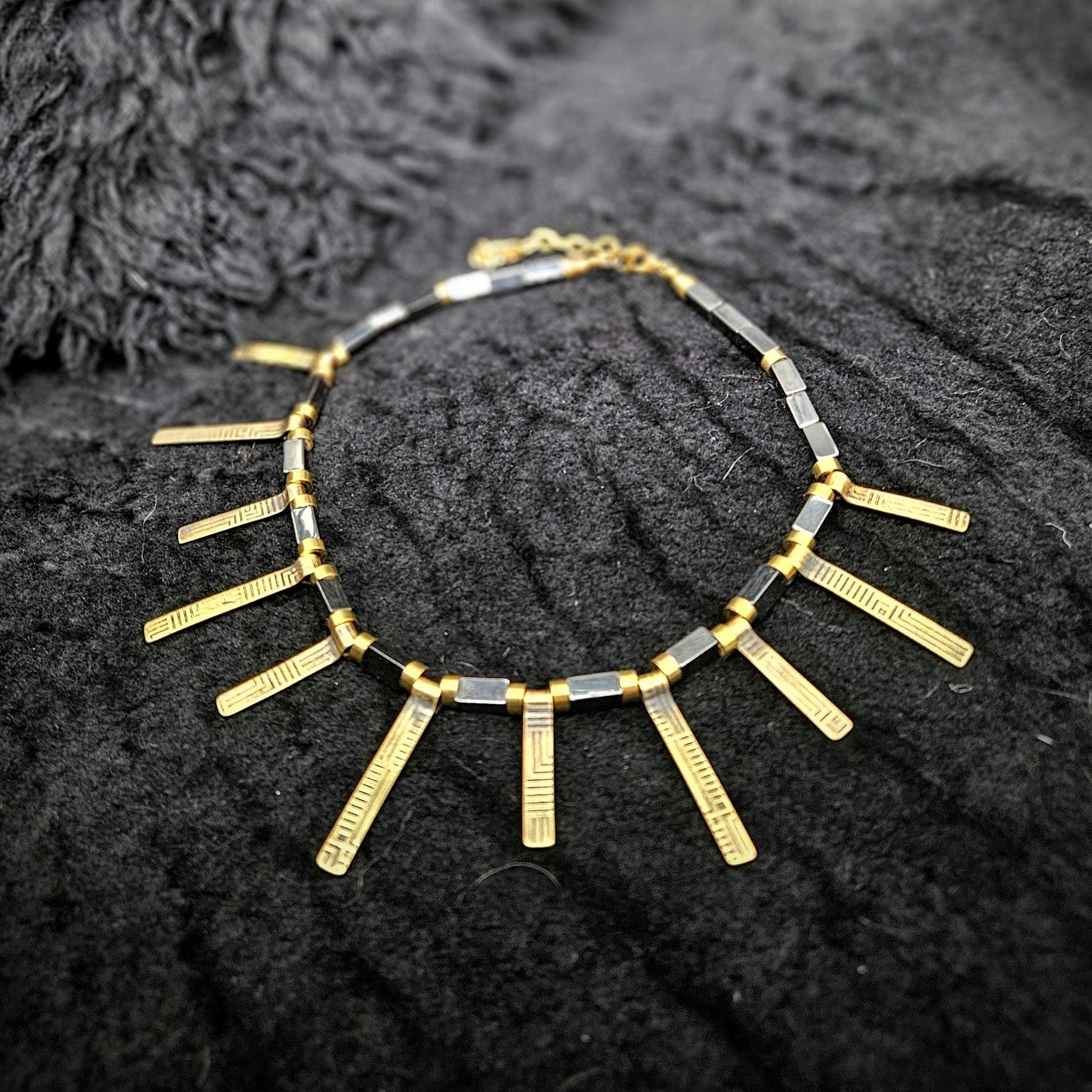 Beaded with magnetic hematite and brass beads. This piece is perfect to adorn your costume from a wide range of eras. This necklace has a classic feel that fits garb ranging from Celtic warriors to Indian queens and everything in between.