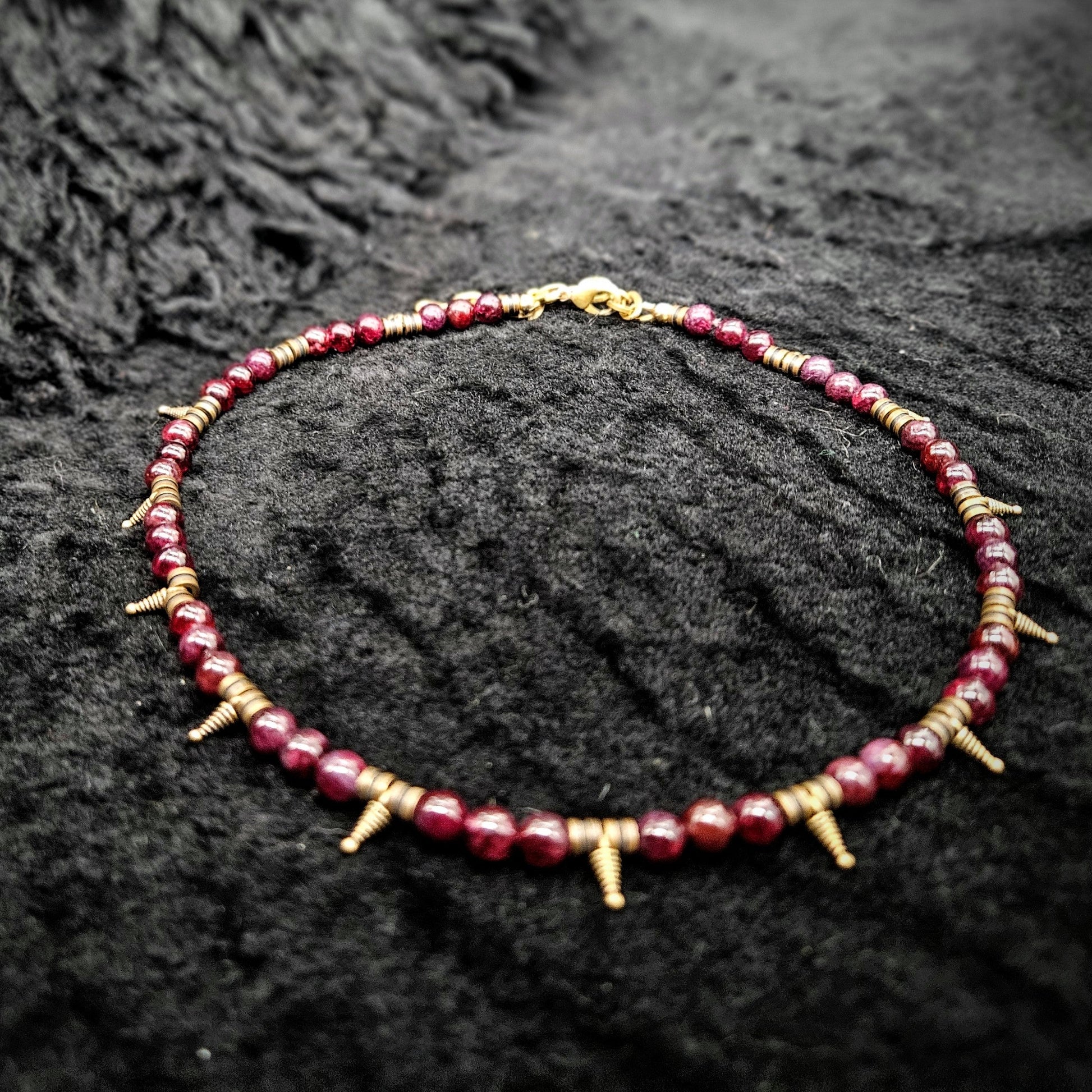 Beaded with garnet and solid brass beads. Layer this choker with other beaded pieces or wear it alone for a simple look.