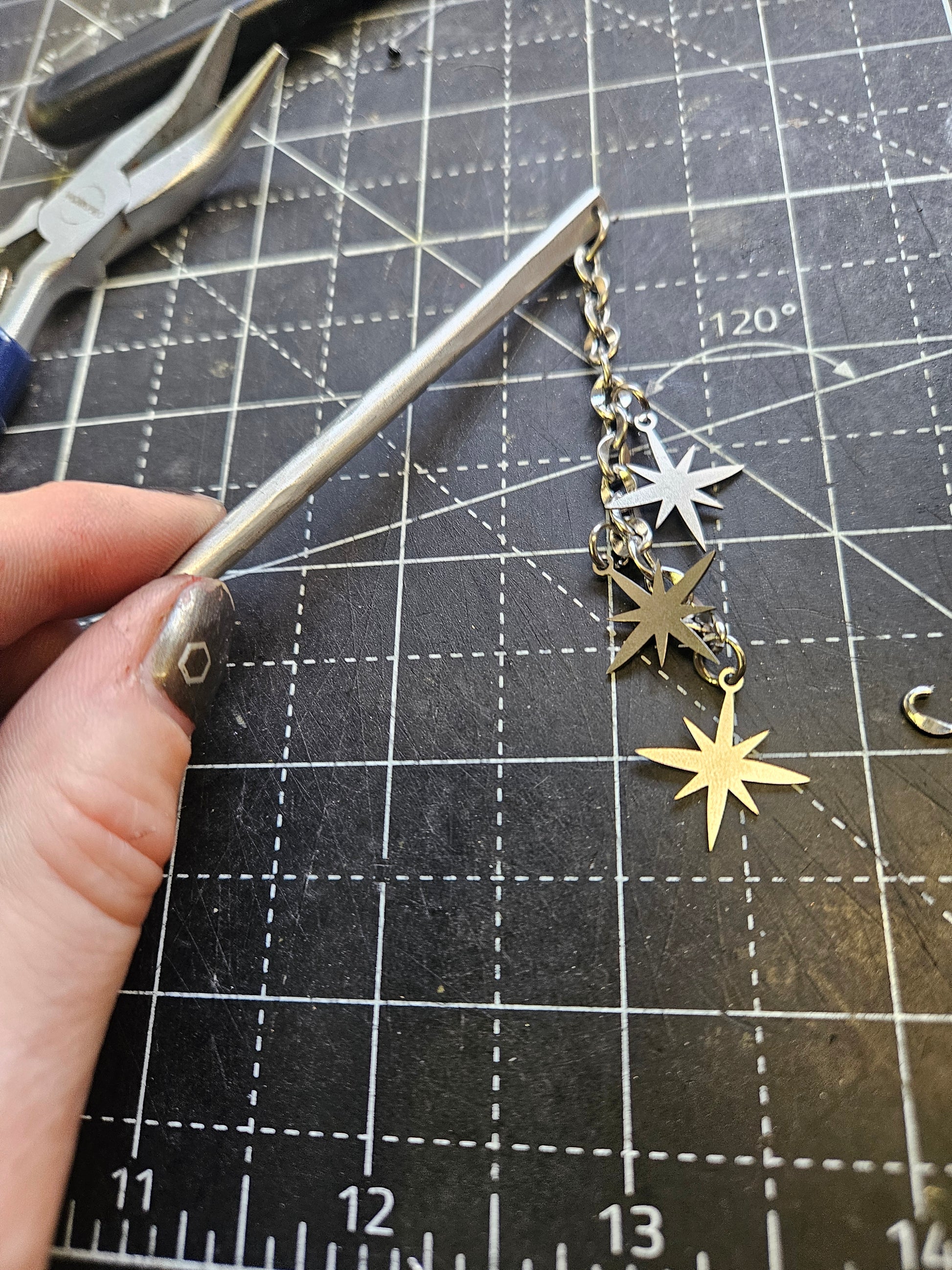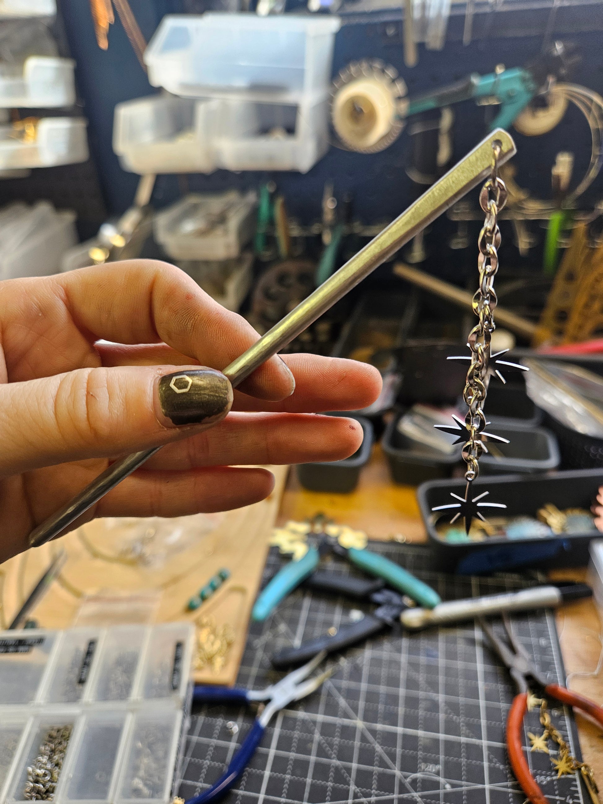 The shaft of this hairstick is made from solid aluminum. The charms, findings, and chain are made from stainless steel.